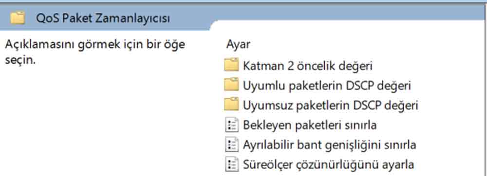 QoS Paket Zamanlayıcı klasörünün içindekiler kısmı yukarıdaki resimdeki gibi karşınıza çıkacaktır. Bu kısımda “Ayrılabilir bant genişliğini sınırla” dosyasını açın.